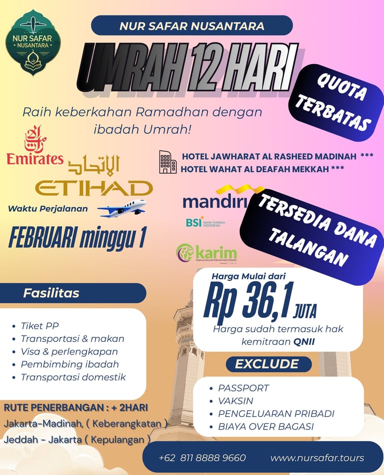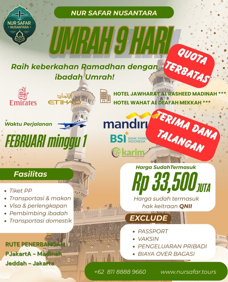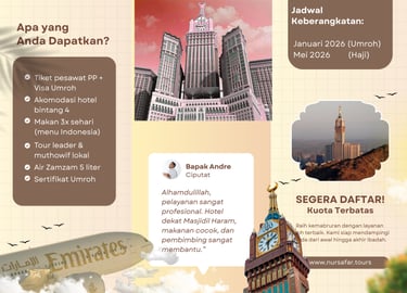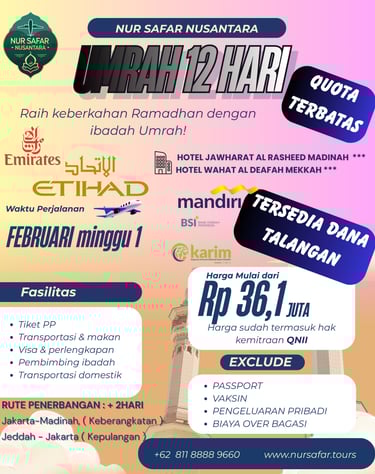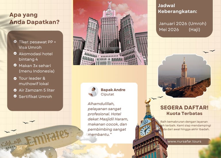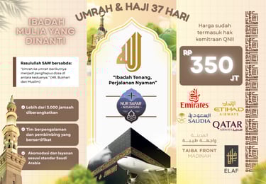 Fokus kami hanya satu : memastikan Anda tiba di tanah suci dengan tenang dan mulia, karena komitmen kami tetap sama : "BERANGKAT DULU ,BAYAR KEMUDIAN !!"